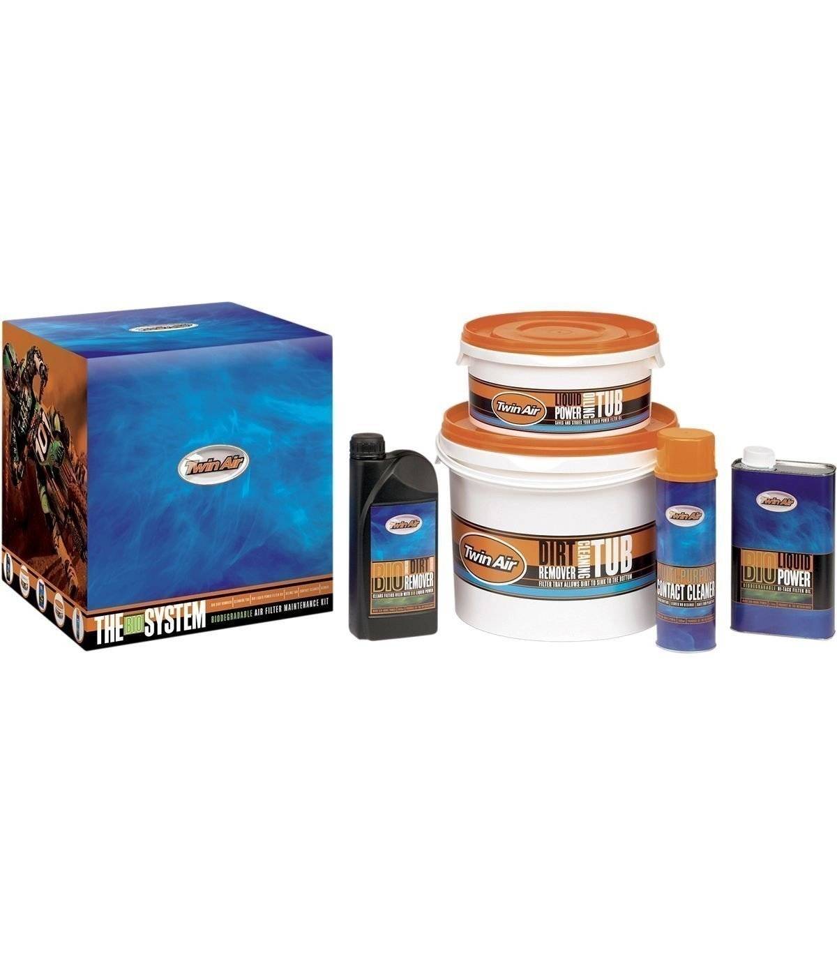 El sistema es la solución integral para el cuidado de filtrosEl kit incluye todo lo necesario para limpiar los filtros de aire TWIN AIR en una resistente caja de almacenaje con asas de transporte.El kit incluye un limpiador en bote TWIN AIR, un lubricante en bote, un limpiador BIO Dirt Remover (1 litro), un aceite para filtros BIO Liquid Power Filter Oil (1 litro), un limpiador de contactos y unos guantes de gomaEl limpiador en bote se puede abrir y volver a cerrar, y viene con una bandeja para filtros que permite que la suciedad se hunda en el fondo lejos de los filtros.El lubricante en bote permite sumergir los filtros para un lubricado fácil y uniformeAl terminar la operación, el lubricante en bote se puede volver a cerrar para aprovecharlo en futuras ocasiones