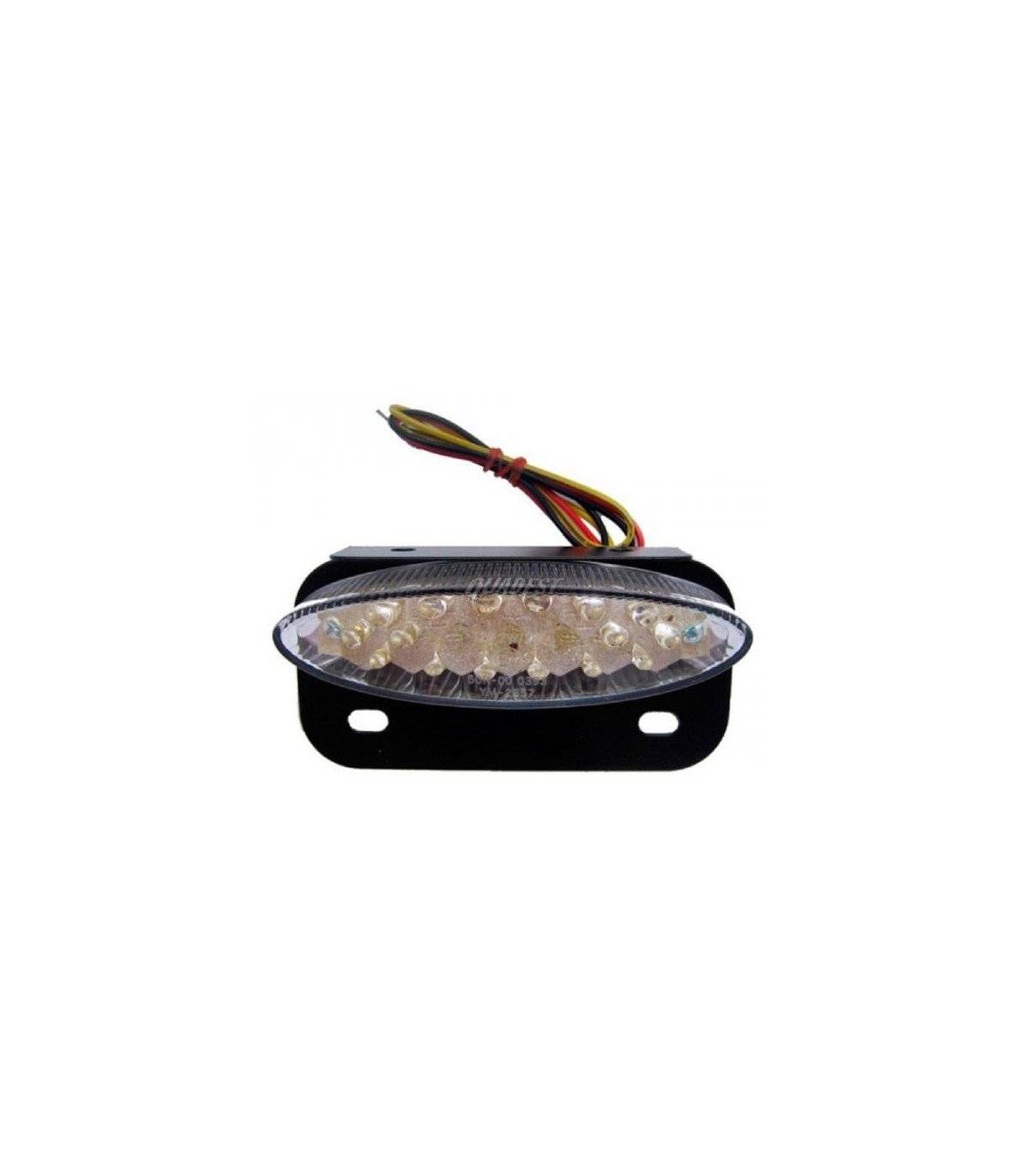 Piloto trasero completo para Motos, Quad y ATV homologado con luz roja, luz matricula y tulipa blanca. Medidas 10 cm largo x 3cm ancho en la parte central. Luz roja, tulipa blanca. Luz para matrícula. Homologado E11. Pasa la ITV
