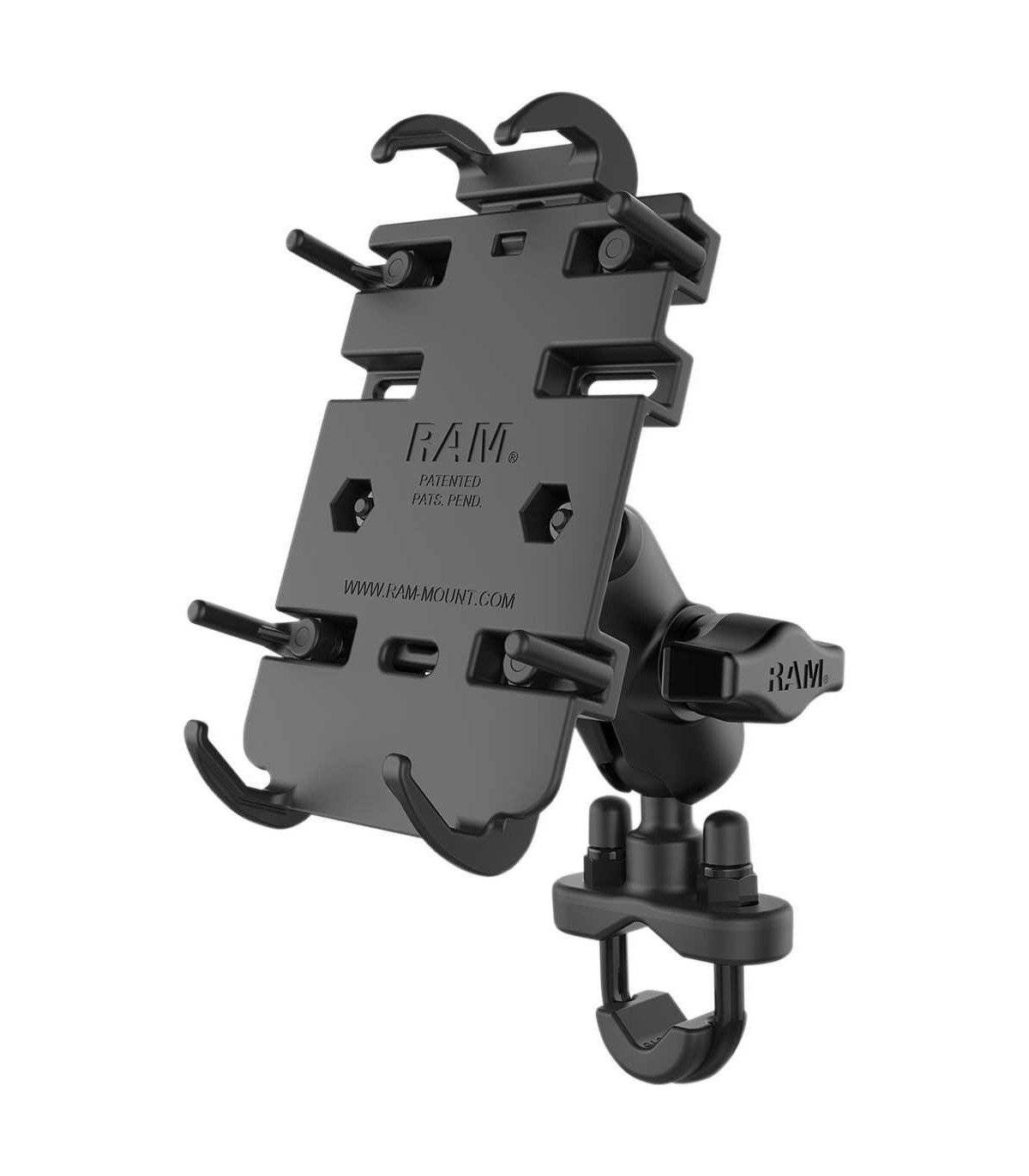 El anclaje de manillar Quick-Grip™ de RAM se compone de una base con tornillo en "U" con revestimiento de cinc, un brazo de doble anclaje y un soporte con resorte integrado compatible con la mayor parte de los teléfonos móvilesEl pack incluye herrajes para molduras de 0.50” a 1.25” de diámetroLa base viene con tapas negras para cubrir los extremos de la abrazadera en U que quedan expuestosEl soporte se compone de un sistema de anclaje con bola en goma de 1” de diámetro RAM con puntos de ajuste en los dos extremos del brazo de doble anclaje, que permite realizar todo tipo de ajustes y garantiza una visibilidad óptimaRAM MOUNT Height Range: 4.75" - 5.75" Width Range: 2.19" - 3.25" Max Depth: 0.72"